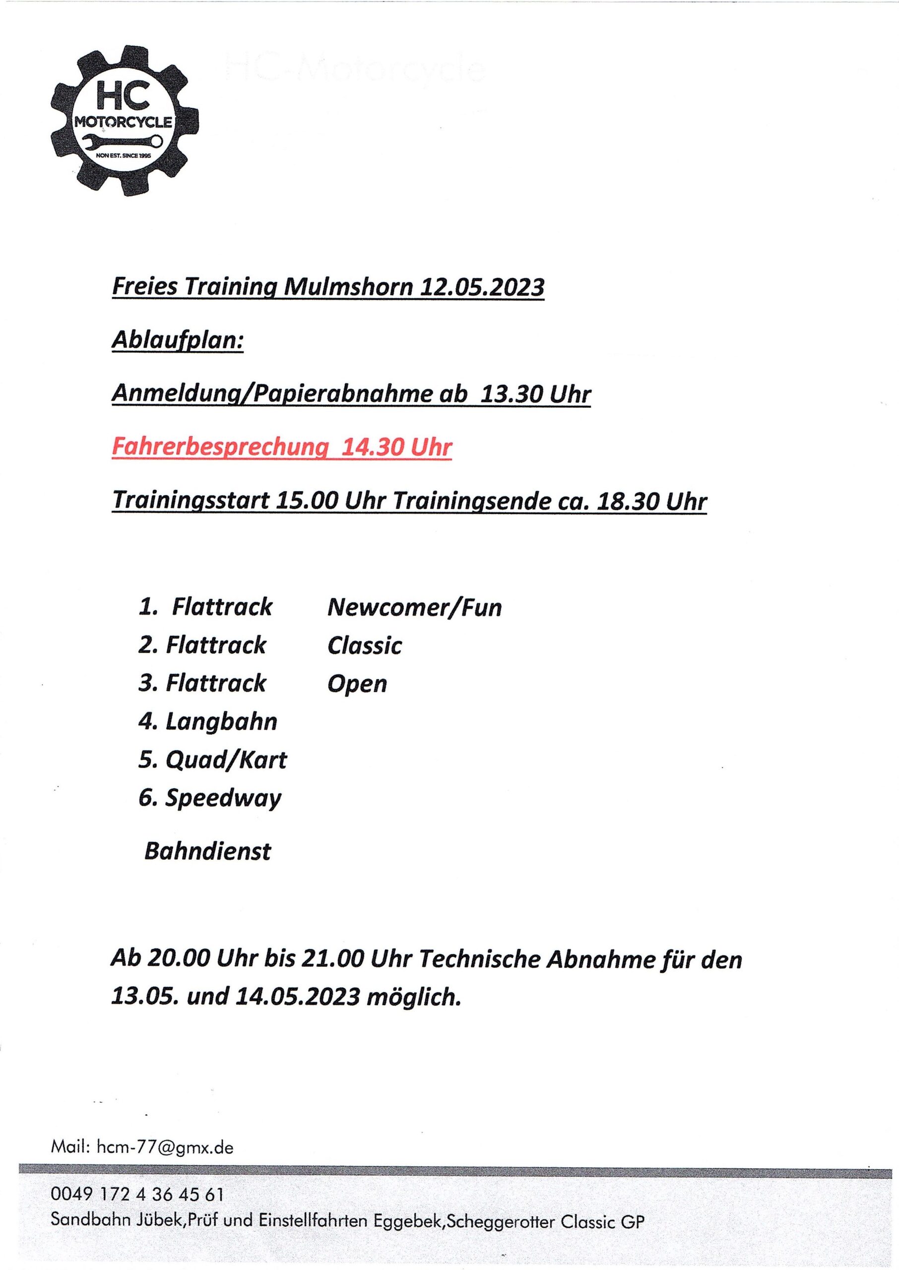 Die Zeitpläne für den 2. Lauf zur Deutschen DMV Quad und Speedkart Meisterschaft auf dem Wümmering in MULMSHORN.